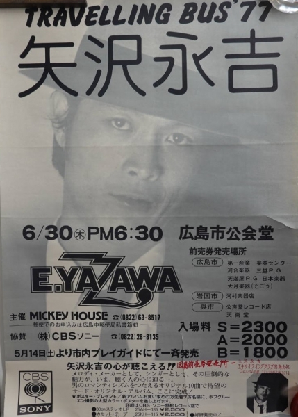 矢沢永吉の1977年の広島で開催のライブのポスターだが、販売は因島にあるエキサイティングファンクラブの因島支部になっている。